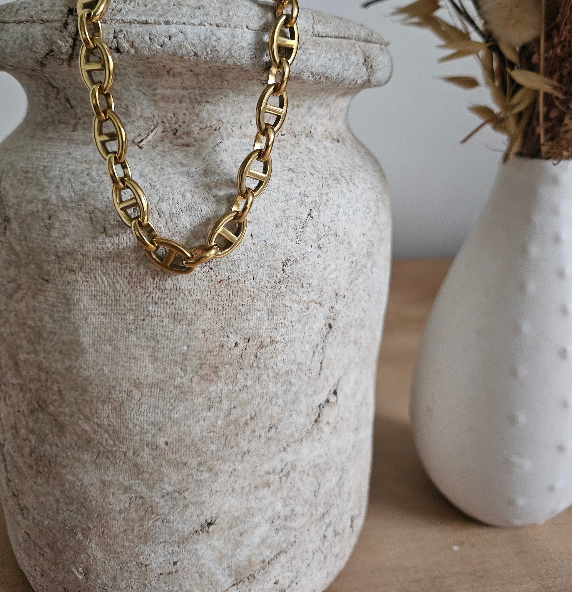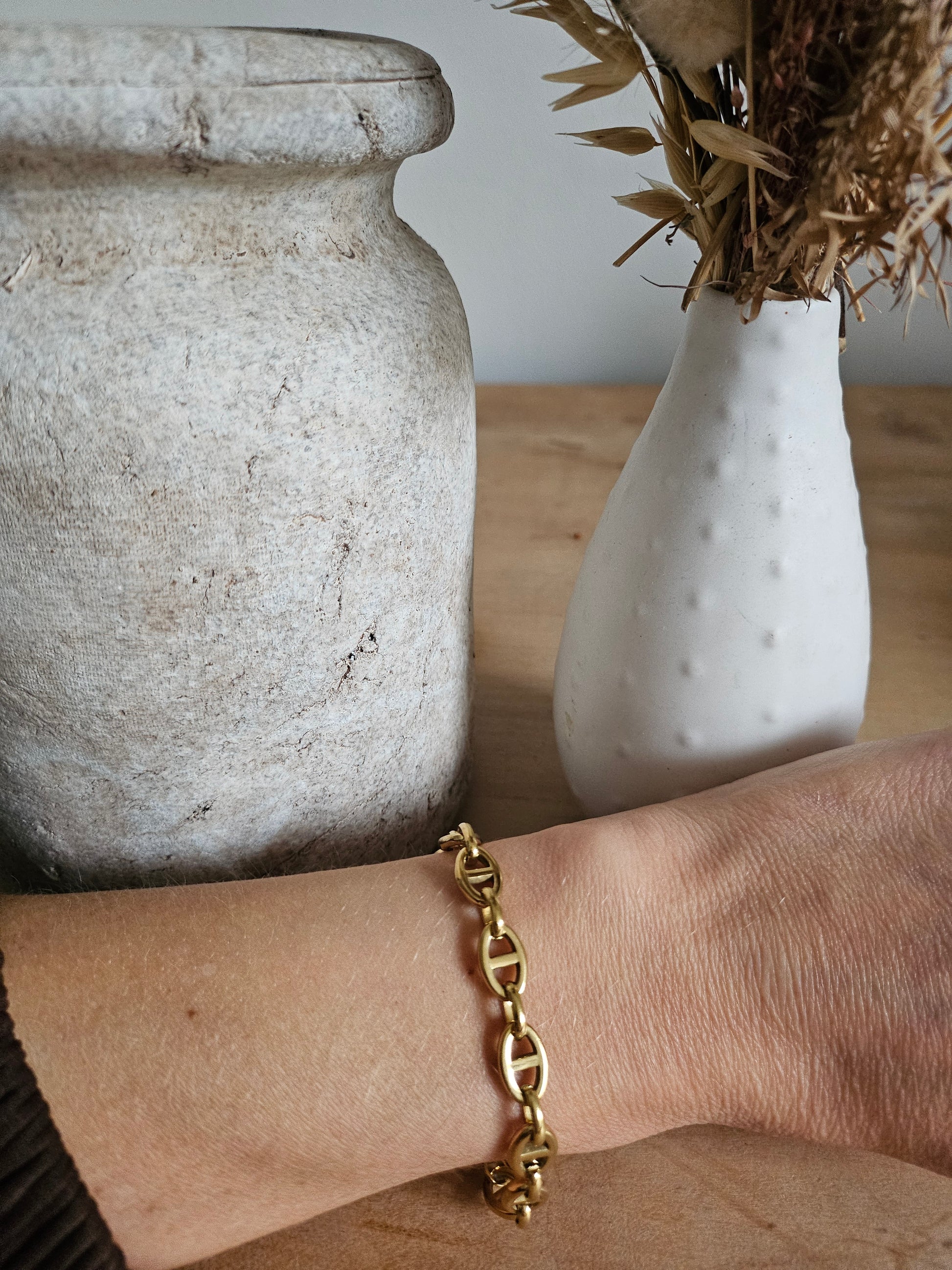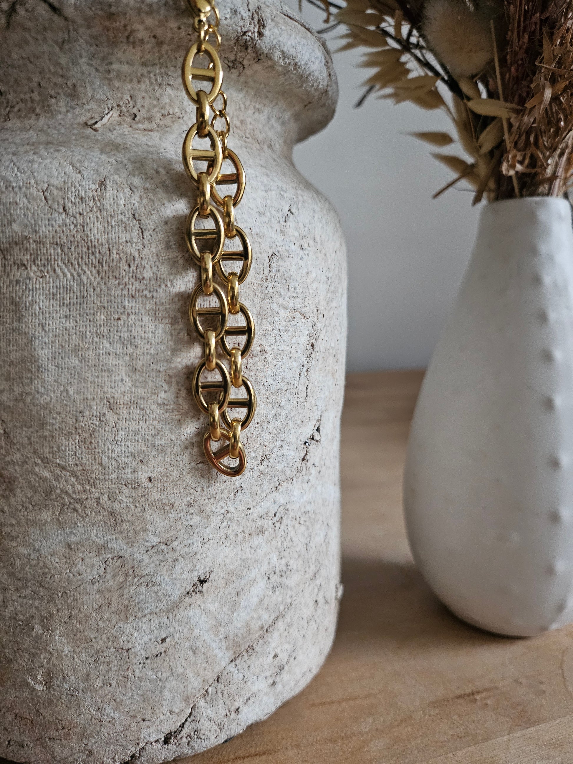 Bracelet en acier inoxydable doré. Maillons ovales et barres graphiques.